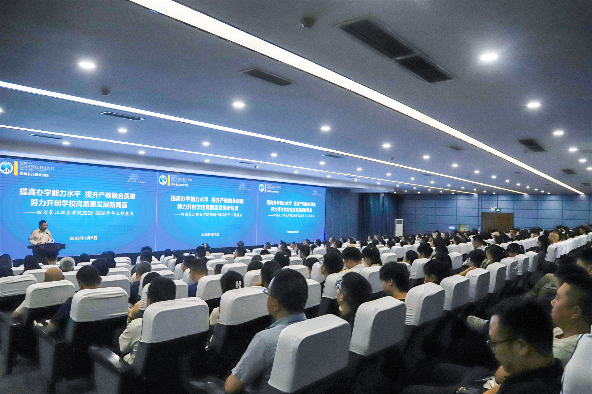【本網(wǎng)消息】(合作處 張慶 供稿)2025年9月5日上午,四川長江職業(yè)學(xué)院在新學(xué)術(shù)報告廳隆重召開新學(xué)年教職工大會。韓虎校長作題為《提高辦學(xué)能力水平 提升產(chǎn)教融合質(zhì)量 努力開創(chuàng)學(xué)校高質(zhì)量發(fā)展新局面》的專題報告,全面部署2025-2026學(xué)年重點工作。大會由常務(wù)副校長耿兵主持,全體教職工參會。