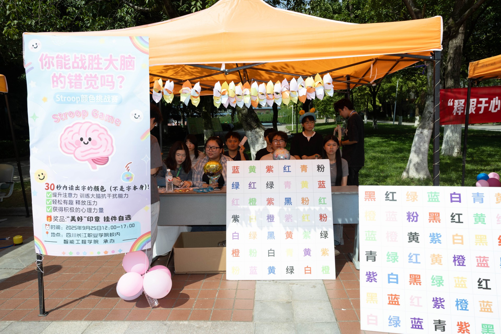 游園會(huì)現(xiàn)場(chǎng)共設(shè)置了六大特色活動(dòng)區(qū)域,內(nèi)容豐富,形式多樣。在“好心情大富翁”區(qū)域,同學(xué)們組隊(duì)協(xié)作,在棋盤格子上完成挑戰(zhàn),增強(qiáng)了大家對(duì)心理健康的認(rèn)識(shí),體驗(yàn)了團(tuán)隊(duì)支持的力量;“Stroop大挑戰(zhàn)”則考驗(yàn)了同學(xué)們的認(rèn)知靈活性,30秒內(nèi)的快速辨識(shí)充滿樂趣與成就感;此外,“纏個(gè)開心結(jié)”、“情緒盲畫”讓學(xué)生們尋找自己內(nèi)心的積極能量、自由書寫心情,“K.O壓力君”通過外化情緒、合理發(fā)泄讓同學(xué)們舒緩焦慮,而“未來信箱區(qū)”則引導(dǎo)學(xué)生沉靜心靈、以發(fā)展的眼光看問題。各活動(dòng)點(diǎn)氣氛熱烈,同學(xué)們?cè)谳p松愉快的互動(dòng)中學(xué)習(xí)心理調(diào)適方法,收獲成長(zhǎng)。