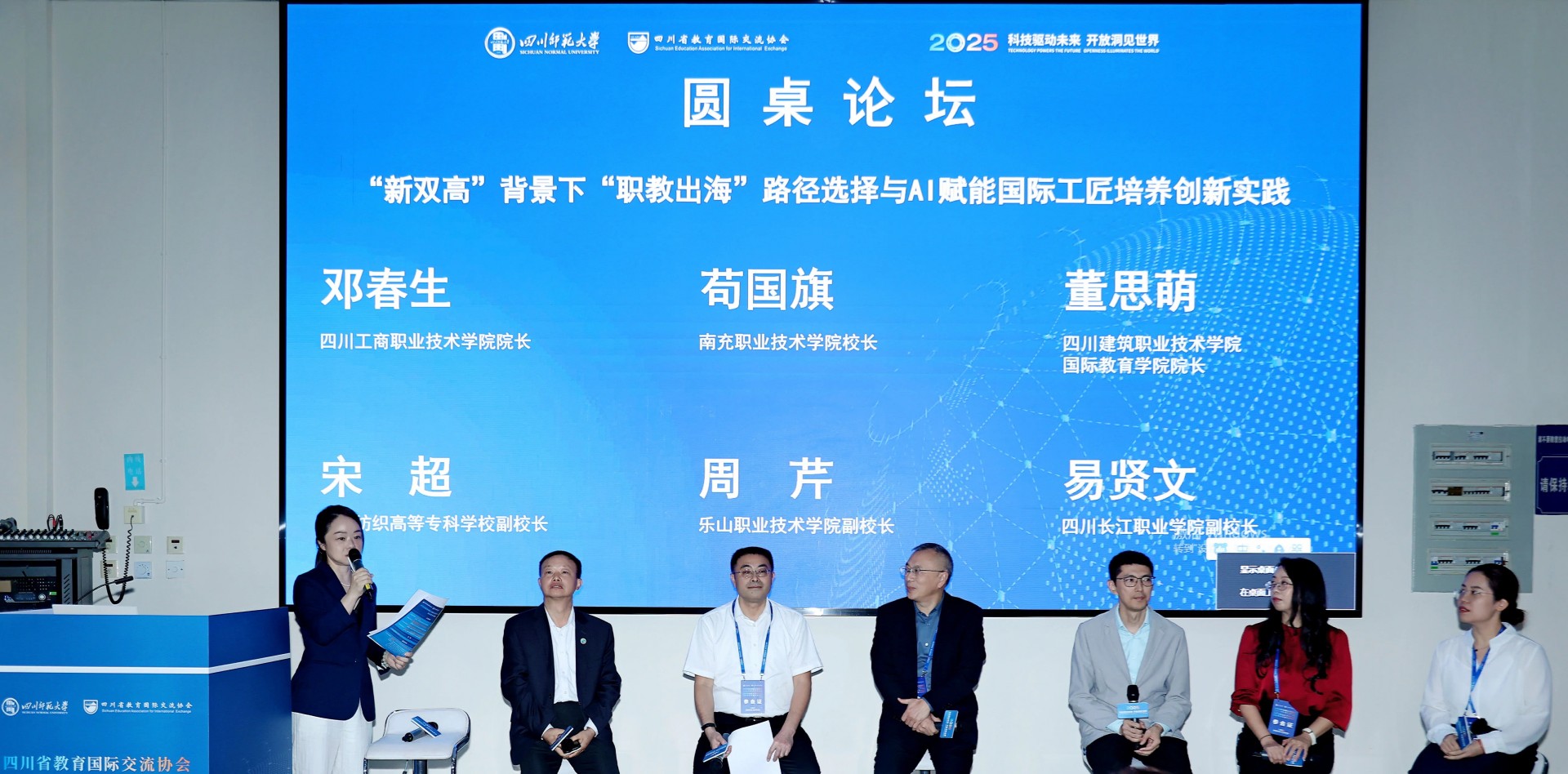 圓桌討論環(huán)節(jié),共邀請(qǐng)了四川建筑職業(yè)技術(shù)學(xué)院、成都紡織高等專科學(xué)校、四川工商職業(yè)技術(shù)學(xué)院、樂(lè)山職業(yè)技術(shù)學(xué)院、南充職業(yè)技術(shù)學(xué)院、四川長(zhǎng)江職業(yè)學(xué)院六所省內(nèi)職業(yè)院校的校領(lǐng)導(dǎo)以“‘新雙高’背景下‘職教出海’路徑選擇與AI賦能國(guó)際工匠培養(yǎng)創(chuàng)新實(shí)踐”為主題展開(kāi)了熱烈而深入的探討。我校副校長(zhǎng)易賢文結(jié)合對(duì)港交流合作的實(shí)踐,分享了打通內(nèi)地學(xué)生赴港實(shí)習(xí)就業(yè)通道,以及構(gòu)建吸引香港學(xué)生來(lái)內(nèi)地創(chuàng)業(yè)就業(yè)雙向交流機(jī)制的經(jīng)驗(yàn)。